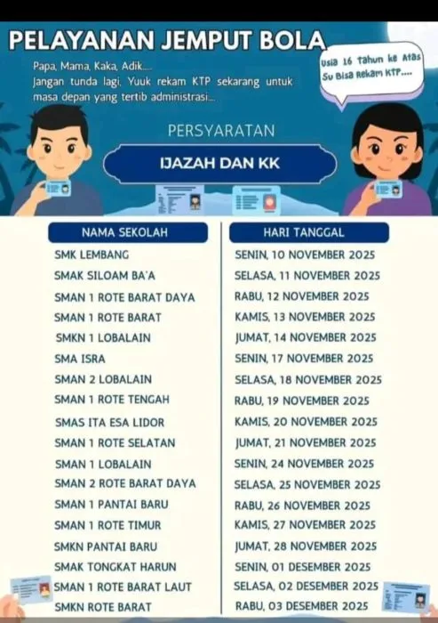 Kegiatan “jemput bola” ini akan dimulai di SMKS Lembang pada tanggal 10 November 2025 dan akan diakhiri di SMKN Rote Barat pada 3 Desember 2025.